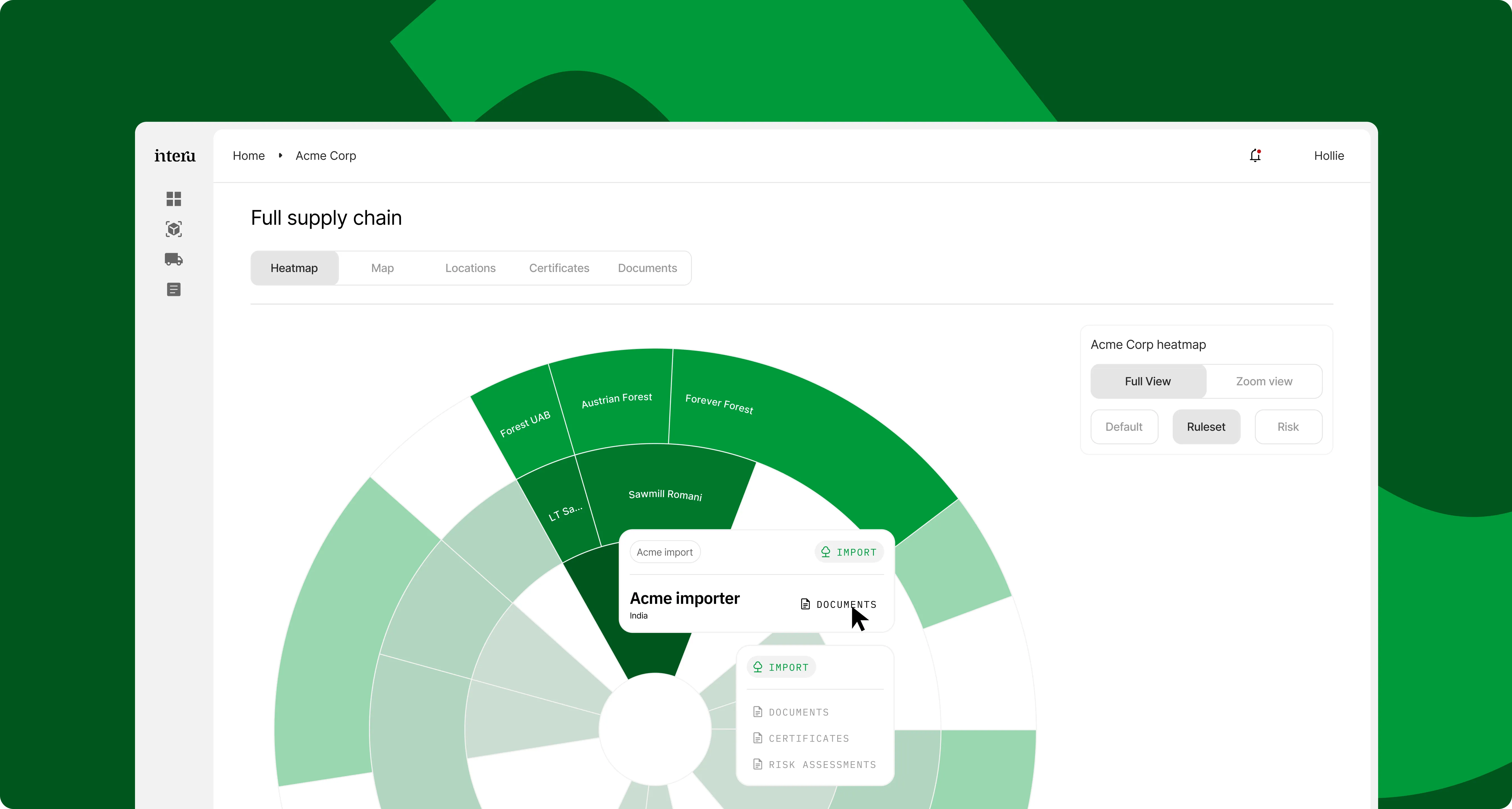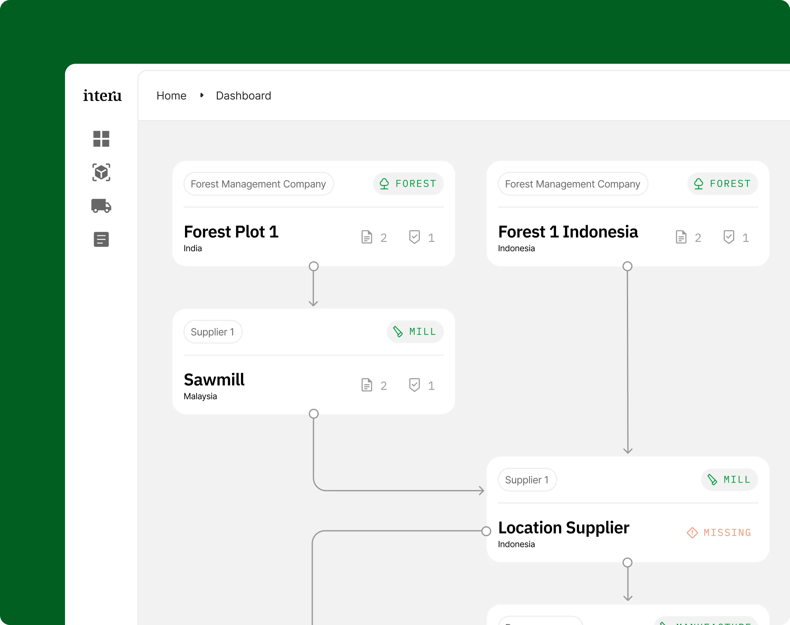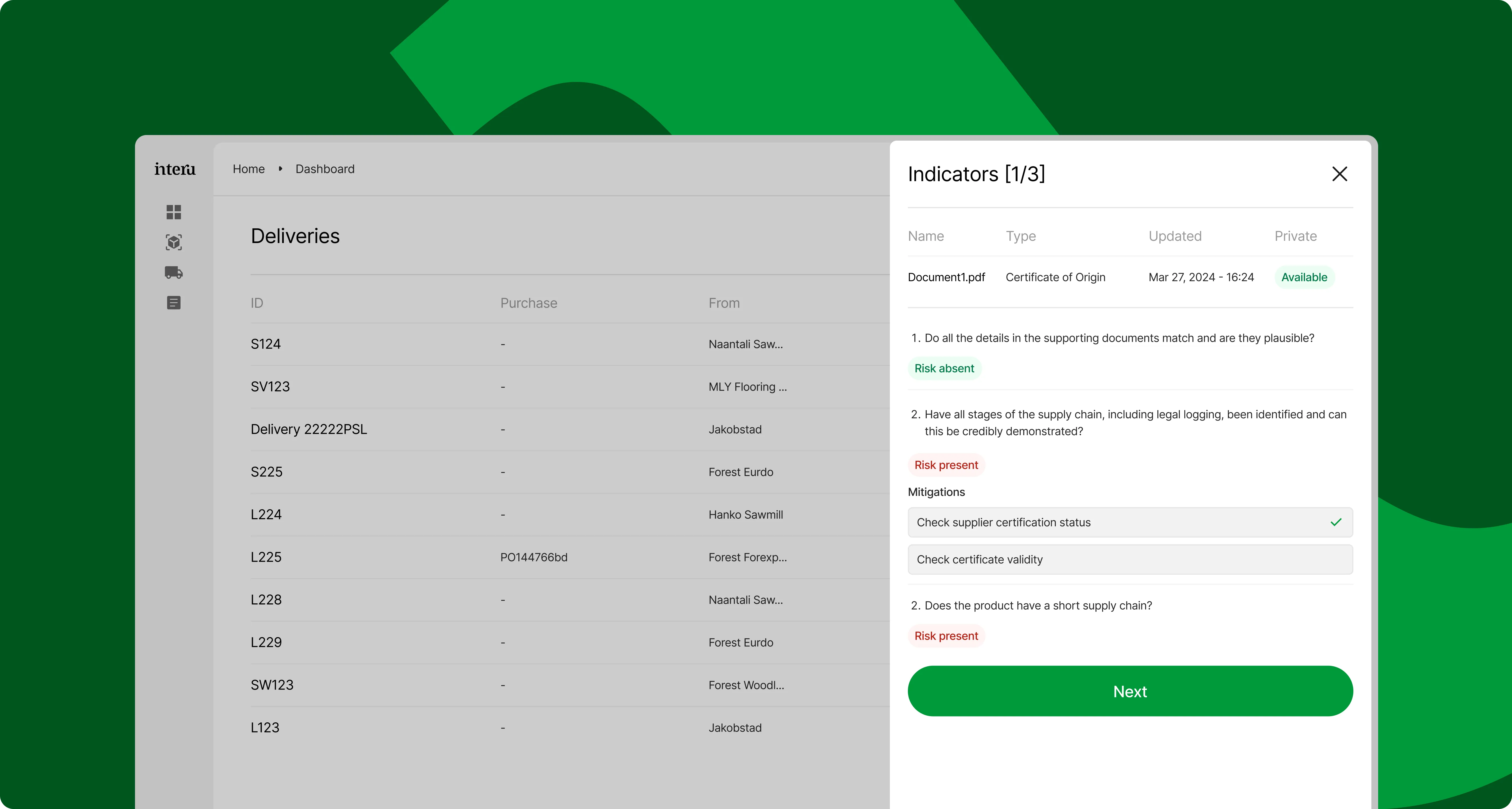 Interu brings supply chain, geospatial and document data together to create a single, defensible view of risk — grounded in evidence and ready for audit.